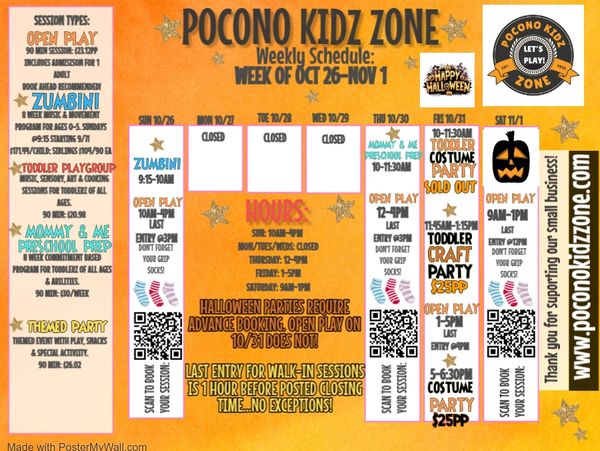 Book ahead for a trial session of our Mommy & Me Preschool Prep on 10/30 at 10AM OR our 2 remaining Halloween parties on Friday 10/31. We are open for walk-ins from 1-5pm on Halloween!