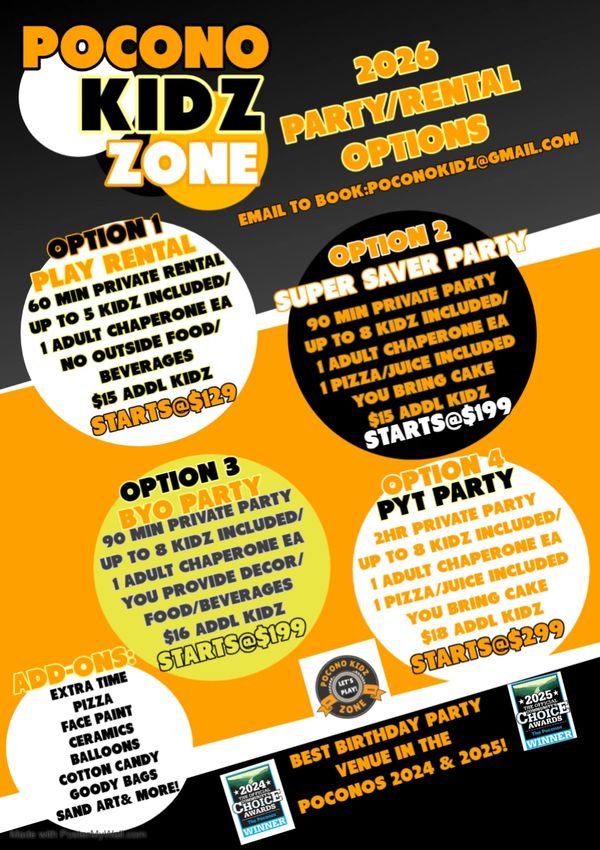 Looking to host your kiddo's next party at the BEST Birthday Party Venue in the Poconos?? It's easy! Our new packages are SUPER budget-friendly & we offer both weekday (Mo-Th) as well as weekend (Fr-Su) options to help you SAVE even more! Email me to get a quote for your next event: poconokidz@gmail.com. Include as many details as possible (date, age of birthday child, desired date (plus a backup date) & any add-ons. We will respond with a quite ASAP!