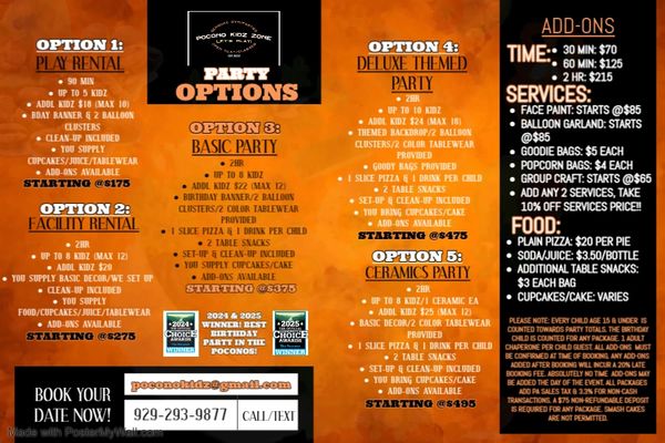 Looking to host your kiddo's next party at the BEST Birthday Party Venue in the Poconos?? We are testing out online booking for some of our facility rental party options. If booking an event in November, please check out the online booking experience. If not booking for November (or you don't see the date and/or package you desire), please shoot us an email with the following details: package number, age of birthday kiddo, desired date (plus a back-up date) plus any questions you might have & we will reach back out to schedule your event. poconokidz@gmail.com
