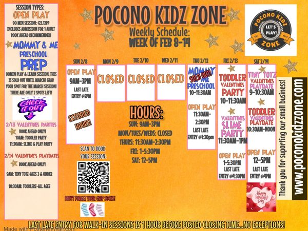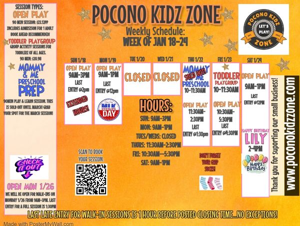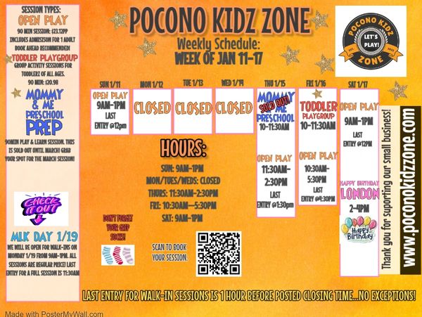 LAST ENTRY FOR ANY SESSION IS 1-HOUR PRIOR TO THE POSTED CLOSING TIME. Please keep this in mind if you are planning on coming as a walk-in to a session. If you arrive one hour prior you will not get a full session and no discounts will be offered on your admission price. Check out our open play times on the weekly calendar posted above! You can also check hours on Google before heading out. Our hours are subject to change due to private events such as parties, private playdates, etc. Check Google before heading to us or contact us if you have specific questions about our hours on a given day. We do private playdates for 4 or more kiddos outside of our normal hours. Email to book yours: poconokidz@gmail.com